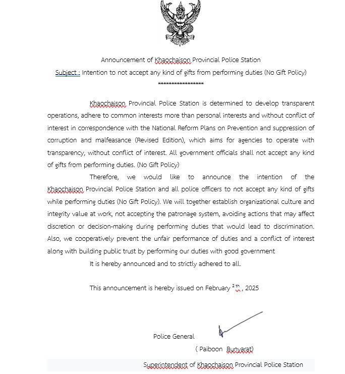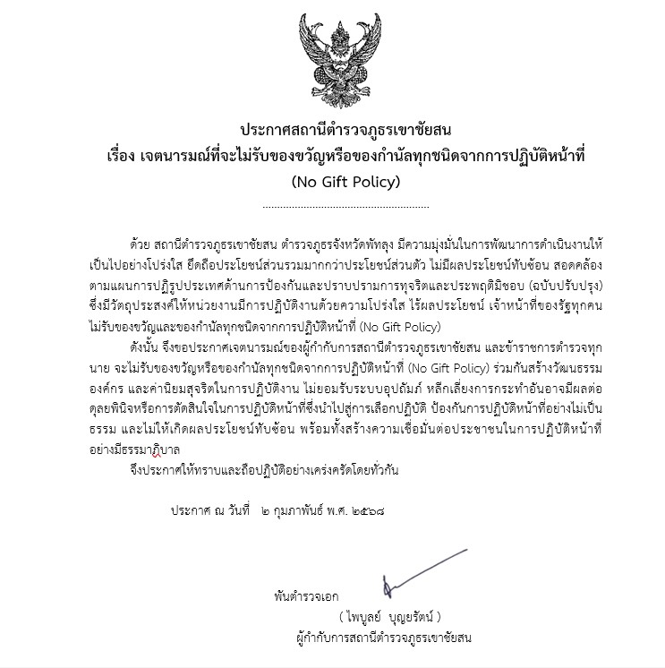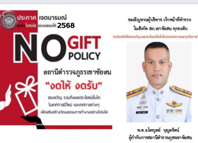 ร่วมประกาศเจตนารมณ์ที่ไม่รับของขวัญและของกำนัลทุกชนิดจากการปฏิบัติหน้าที่ (No Gift Poiicy)