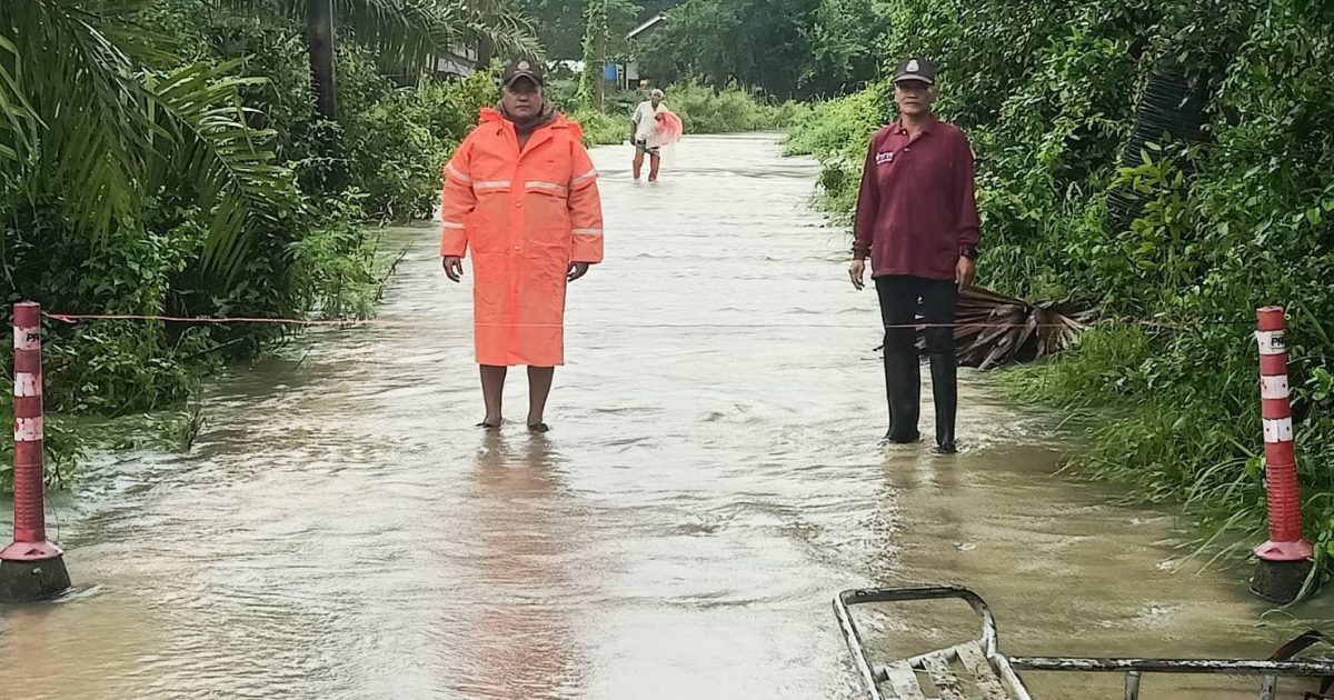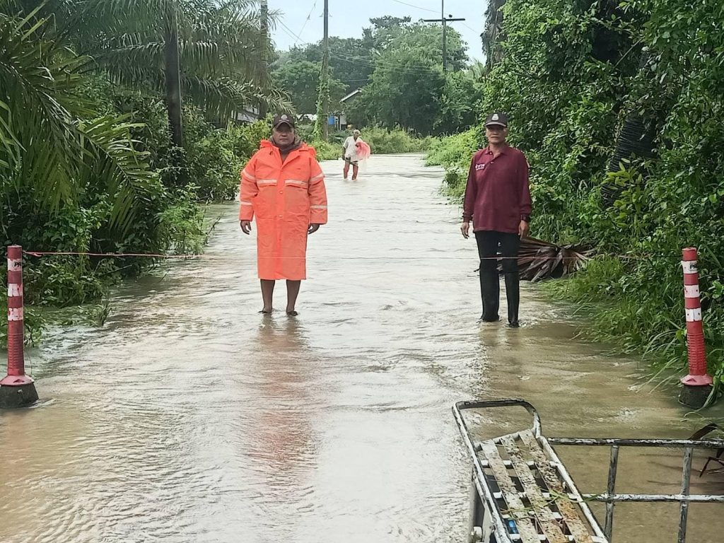 วันนี้ 28 พ.ย.2567 เวลา 10.40 น.ร.ต.ท. นิยม เซ่งอิ้น.รอง สว. (ป) รตท.จำนง ปานเหล่.รอง.สว.(ป)สภ. เขาชัยสน ปฏิบัติหน้าที่ สายตรวจ ต.หานโพธิ์ ออกตรวจสอบสภาพน้ำพื้นที่- ม.9 บ้านโคกเค็ดม.10 บ้านนาดอน หน้าวัด ป่าแหลม ต.หานโพธิ์ พบว่าถนนภายในหมู่บ้านน้ำท่วมผ่านทุกสาย รถเล็กไม่สามารถผ่านสัญจรไปมาได้เข้าช่วยเหลือราษฎรในพื้นที่น้ำท่วมขนย้ายยานพาหนะ และสิ่งของขึ้นมาไว้บริเวณที่สูงสำหรับถนนสายหลักชุมชนบ้านไสโหนดน้ำท่วมผิวจราจรประมาณ 30 -40ซม.ราษฏรเดือดร้อน 75 ครอบครัว ชุมชนบ้านโคกเค็จเดือด 30 ครัวได้อำนวยความสะดวกการจราจรนำกรวยยางเป็นสัญลักษณ์เตือนภัยสำหรับการสัญจร
