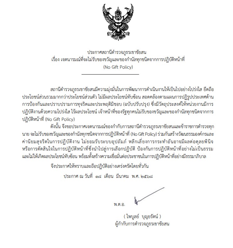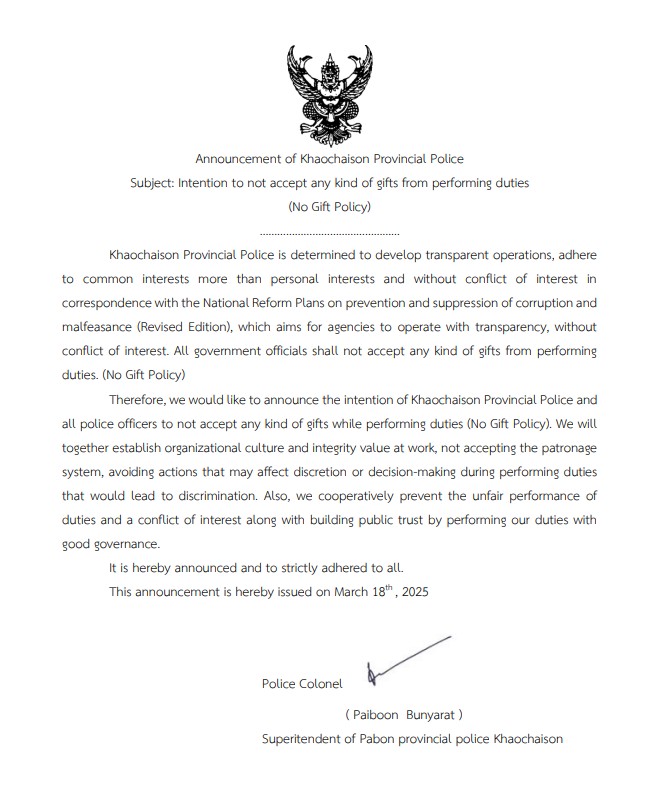 ประกาศนโยบายต่อต้านการรับสินบน
